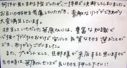 何件か見てまわる予定でしたが、一件目で決断して しまいました。お互いの好みを考慮していただき、 素敵なリングができあがり大変満足しています。 担当していただいた笹原さんには、豊富な知識で心強いアドバイスのおかげで安心して良質なものを選ぶことができ、ありがとうございました。 また、プレゼントとして、旦那様が来店すると思いますのでその時は笹原さんセンスで良い物を押して下さい!!