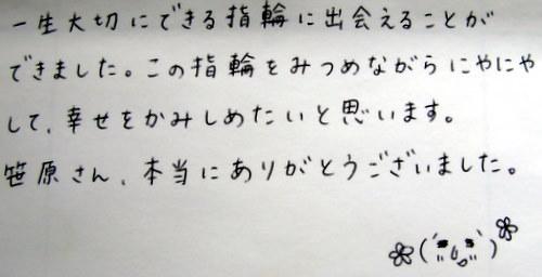 一生大切にできる指輪に出会えることが、 できました。この指輪をみつめながら にやにやして、幸せをかみしめたいと思います。 笹原さん、本当にありがとうございました。 ※イラスト付き (*^_^*)