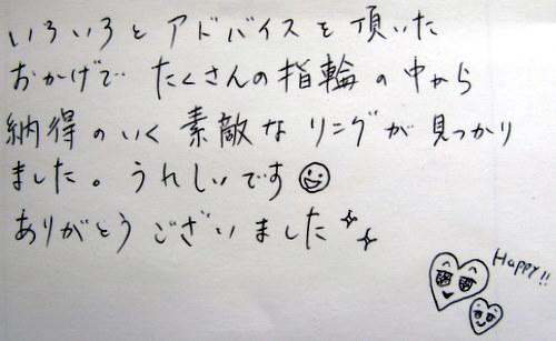 いろいろとアドバイスを頂いたおかげで たくさんんの指輪の中から納得のいく素敵な リングが見つかりました。うれしいです(^.^) ありがとうございました☆☆(*^_^*)
