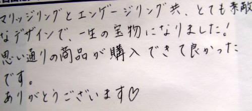 マリッジリングとエンゲージリング共、とても 素敵なデザインで、一生の宝物になりました! 思い通りの商品が購入できて良かったです。 ありがとうございます?