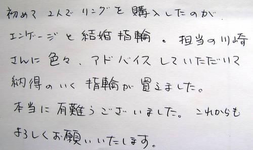 初めて2人でリングを購入したのが、 エンゲージと結婚指輪。担当の川崎さんに 色々、アドバイスしていただいて納得のいく 指輪が買えました。 本当に有難うございました。これからも よろしくお願いいたします。