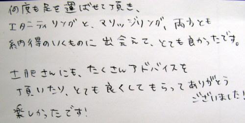 何度も足を運ばせて頂き、エタニティリングと、 マリッジリング、両方とも納得のいくものに 出会えて、とても良かったです。