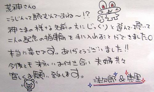 荒神さん。 こうじんって読むんですよね~!? 神さまの様な名前の方にじっくりと選んで 頂いて二人の記念の指輪を手に入れることが できました。本当に幸せです。 ありがとうございました!!今後とも末永い お付き合い夫婦共々宜しくお願い致します。
