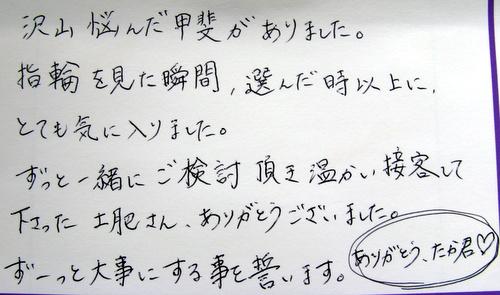 沢山悩んだ甲斐がありました。 指輪を見た瞬間、選んだ時以上に、 とても気に入りました。ずっと一緒に ご検討頂き温かい接客して下さった土肥さん、 ありがとうございました。 ずーっと大事にする事を誓います。 ありがとう、たか君?