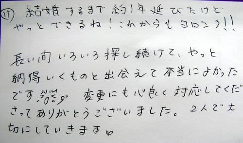 ゆ:長い間いろいろ探し続けて、やっと 納得いくものと出会えて本当によかったです (ToT)/ 変更にも心良く対応してくださって ありがとうございました。 2人で大切にしていきます?