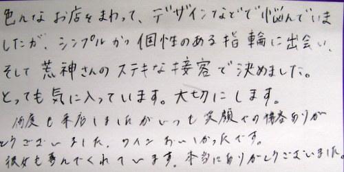 色んなお店をまわって、デザインなどで悩んで いましたが、シンプルかつ個性のある指輪に 出会い、そして荒神さんのステキな接客で 決めました。とっても気に入っています。 大切にします。