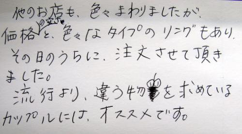 他のお店も、色々まわりましたが、 価格の安さと、色々なタイプのリングもあり、 その日のうちに、注文させて頂きました。 流行より、違う物を求めているカップルには オススメです。