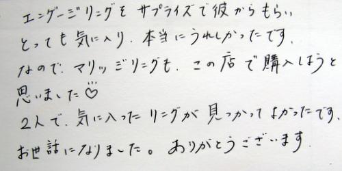 2人で、気に入ったリングが見つかって よかったです。お世話になりました。 ありがとうございます。