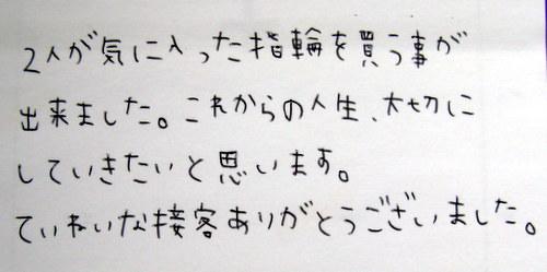 2人が気に入った指輪を買う事が出来ました。 これからの人生、大切にしていきたいと思います。 ていねいな接客ありがとうございました。