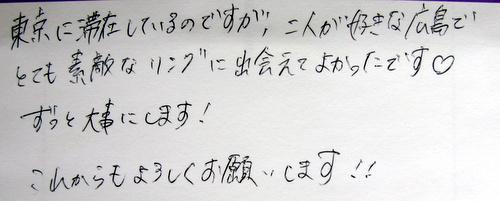 東京に滞在しているのですが、二人が好きな 広島でとても素敵なリングに出会えてよかった です?ずっと大事にします! これからもよろしくお願いします!!