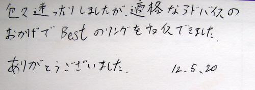 色々迷ったりしましたが、適格なアドバイスの おかげでBestのリングをチョイスできました。