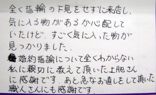 婚約指輪について全くわからない私に親切に 教えて頂いた土肥さんに感謝です。 あと急なお直しをして頂いた職人さん にも感謝です。
