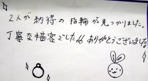 2人が納得の指輪が見つかりました。 丁寧な接客でした!!ありがとうございました。 ※イラスト付き