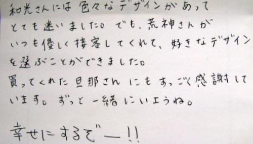 和光さんには色々なデザインがあって とても迷いました。でも、荒神さんが いつも優しく接客してくれて、好きな デザインを選ぶことができました。