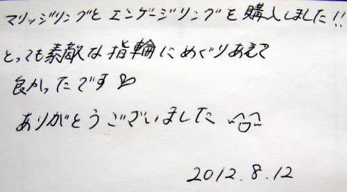 マリッジリングとエンゲージリングを 購入しました!!とっても素敵な指輪に めぐりあえて良かったです? ありがとうございました(*^_^*)