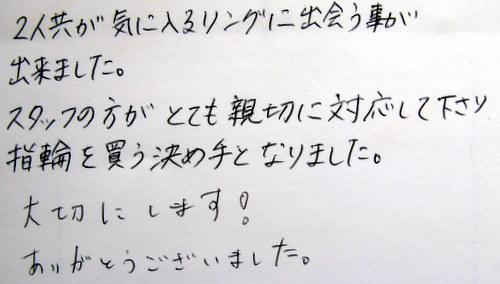 2人共が気に入るリングに出会う事が 出来ました。スタッフの方がとても親切に 対応して下さり指輪を買う決めてとなりました。