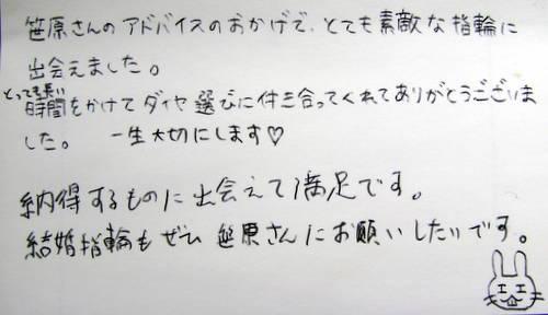 笹原さんのアドバイスのおかげで、とても 素敵な指輪に出会えました。 とっても長い時間をかけてダイヤ選びに 付き合ってくれてありがとうございました。 一生大切にします?