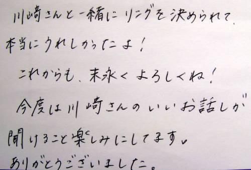 川崎さんと一緒にリングを決められて、 本当にうれしかったよ! これからも末永くよろしくね! 今度は川崎さんのいいお話しが聞けること 楽しみにしています? ありがとうございました。