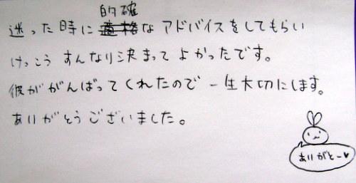 迷った時に的確なアドバイスをしてもらい けっこうすんなり決まってよかったです。 彼ががんばってくれたので一生大切にします。 ありがとうございました。 (*^_^*)ありがとー☆