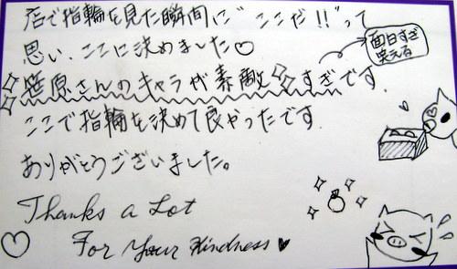 店で指輪を見た瞬間に”ここだ!!”って 思い、ここに決めました? ☆笹原さんのキャラが素敵☆すぎです。 →面白すぎ笑える ここで指輪を決めて良かったです。 ありがとうございました。※イラスト付き