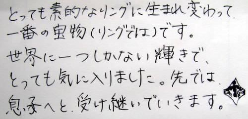 とっても素敵なリングに生まれ変わって、一番の 宝物(リングでは)です。 世界に一つしかない輝きで、とっても気に入りました。先では、息子へと、受け継いでいきます。 ※イラスト付き