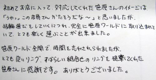 笹原ワールド全開で、時間を忘れされられましたが、とても良いリング、すばらしい組み合わせのリングを提案しれくれた笹原さんに感謝です。