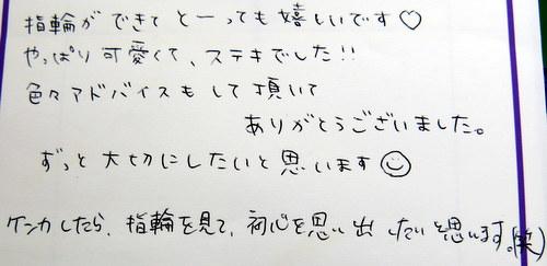 指輪ができてとーっても嬉しいです?やっぱり可愛くて、ステキでした!!色々アドバイスもして頂いてありがとうございました。 ずっと大切にしたいと思います(^_^)