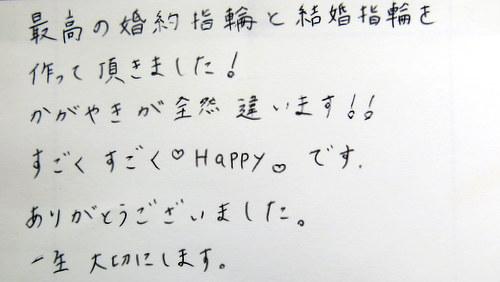 最高の婚約指輪と結婚指輪を作って頂きました!かがやきが全然違います!!すごくすごく?HAPPY?です。ありがとうございました。 一生大切にします。
