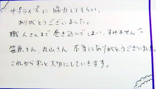 サプライズに協力してもらい、ありがとうございました。職人さんまで巻き込んでしまい、すみません。笹原さん、丸山さん本当にありがとうございました。これからずっと大切にしていきます。