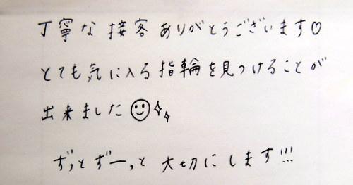 丁寧な接客ありがとうございます?とても気に入る指輪を見つけることが出来ました(*^_^*)☆ ずっとずーっと大切にします!!!
