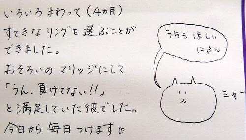いろいろまわって(4ヶ月)すてきなリングを選ぶことができました。おそろいのマリッジにして「うん、負けてない!!」と満足していた彼でした。今日から毎日つけます?※イラストつき