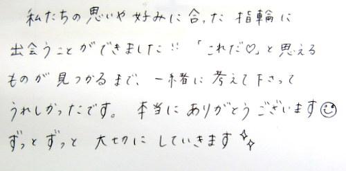 私たちの思いや好みに合った指輪に出会うことができました!!「これだ?」と思えるものが見つかるまで、一緒に考えて下さってうれしかったです。本当にありがとうございます(*^_^*)ずっとずっと大切にしていきます☆☆