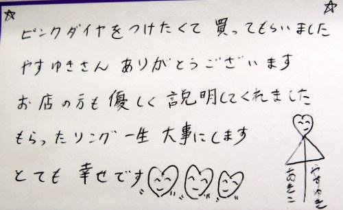 ピンクダイヤをつけたくて買ってもらいました やすゆきさんありがとうございます お店の方も優しく説明してくれました もらったリング一生大事にします とても幸せです???
