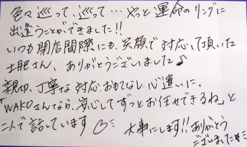 色々巡って、巡って…やっと運命のリングに出逢うことができました!! いつも閉店間際にも、笑顔で対応して頂いた土肥さん、ありがとうございました♪ 親切、丁寧な対応、おもてなし、心遣いに、「WAKOさんなら、安心してずっとお任せできるね」と二人で話しています?大事にします!!ありがとうございました☆彡